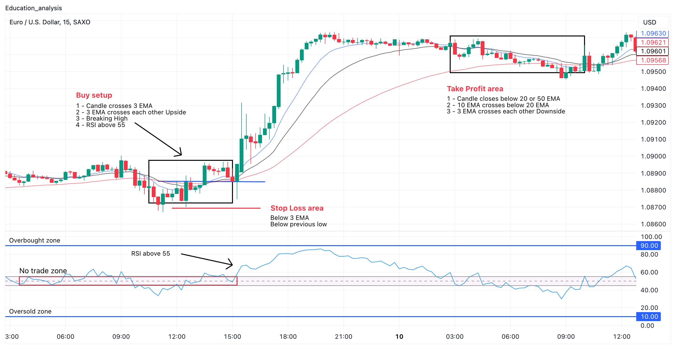 นี่คือการตั้งค่าอย่างง่ายของ 3 EMA และ RSI พร้อมด้วยระดับราคา (โซน S&R และเส้นแนวโน้มในกรอบเวลา H1) และกรอบเวลาการเทรด M15